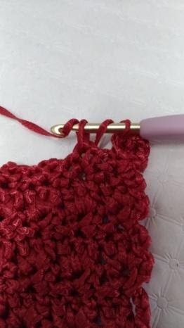 Depois fazer 2 correntinhas, 1 ponto meio alto pela metade e depois no próximo ponto outro meio ponto alto pela metade e tirar tudo. No segundo ponto não dar laçada e continuar e fazer igual no final da carreira que é o outro lado, virar o trabalho.